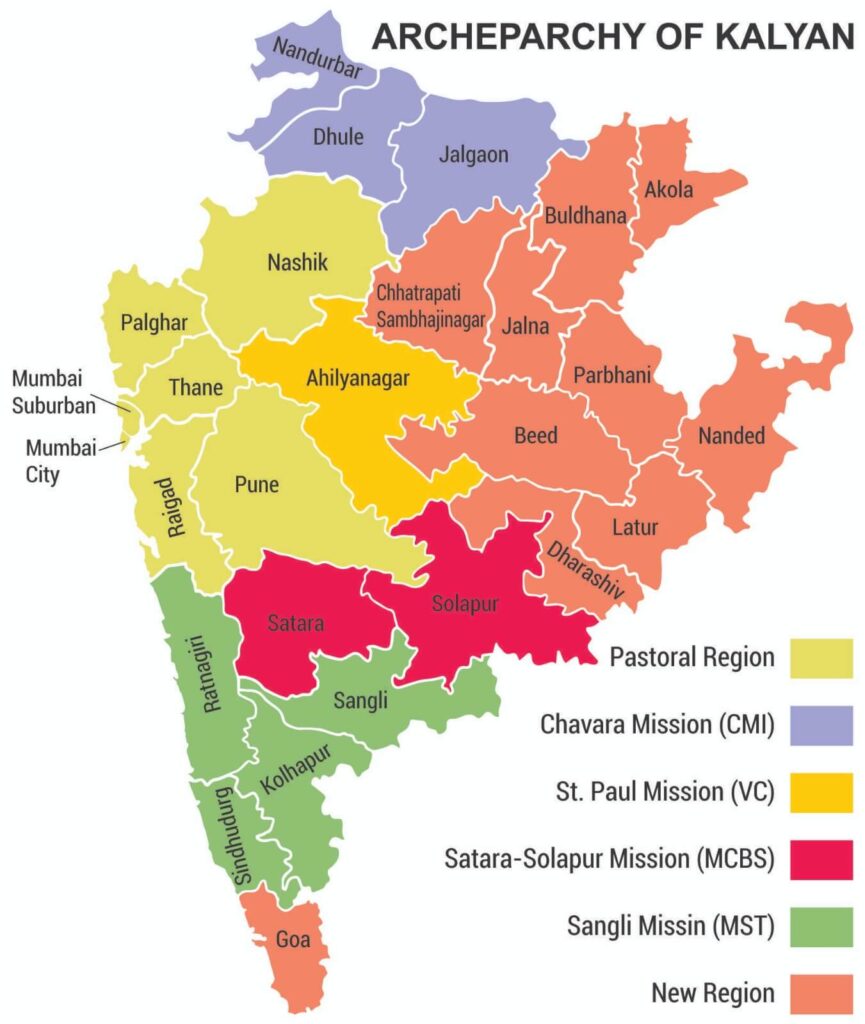 In order to make sure of the Christians presence and services in all 15 civil districts of the Eparchy, 10 of them were entrusted to MST, VC, MCBS and CMI religious congregations. On May 1st, 1990 Sangli, Kolhapur, Sindhudurg, Ratnagiri districts were formed as St. Thomas Mission of MST Congregation. On 11th September 1991, Ahmednagar district was made Vincentian mission of Vincentian Congregation. On 4th October 1992, Satara and Solapur districts were formed as MCBS Mission. On 2nd February 1993, Jalgao and Dhule districts were made Chavara mission of CMI Congregation.